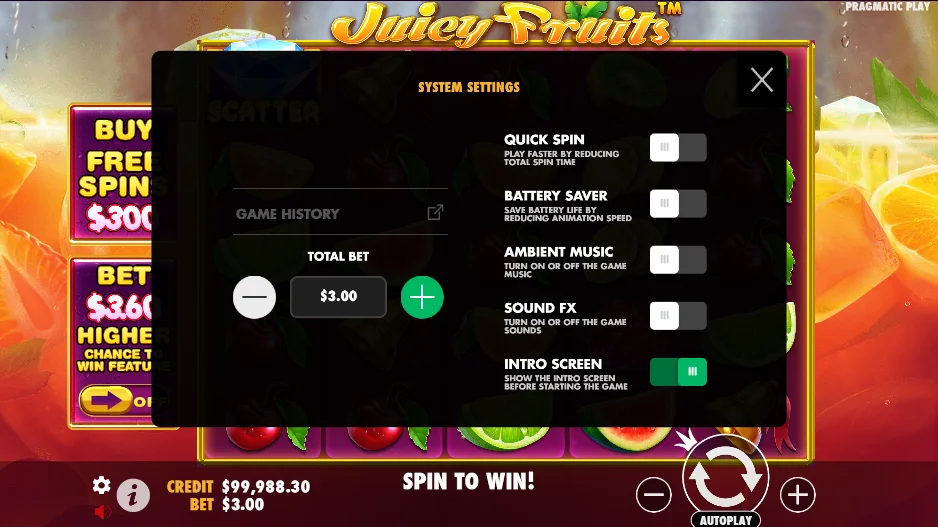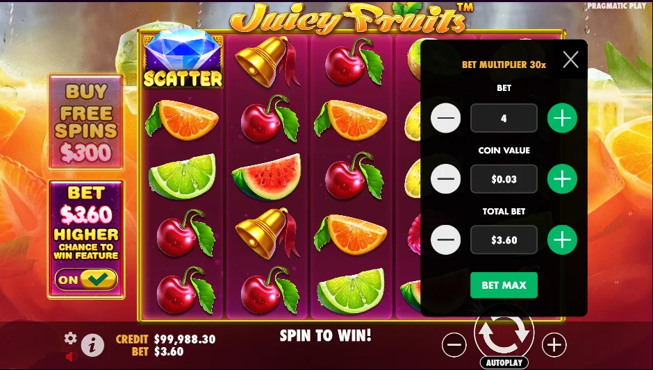 - Bevor Sie Juicy Fruits um Echtgeld spielen, sollten Sie den Demomodus nutzen.